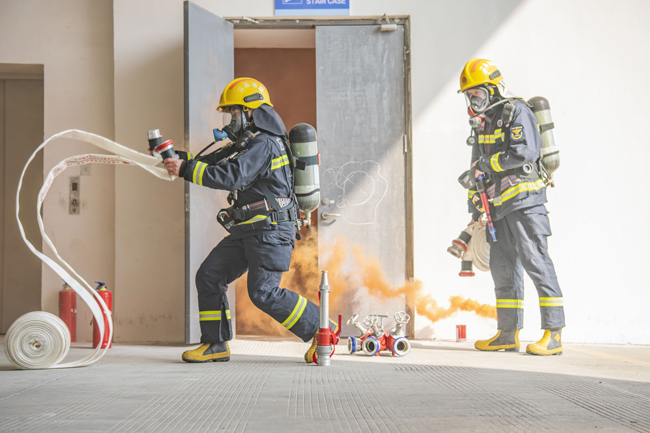 此次演練完全按照“真實模擬火場、現(xiàn)場領(lǐng)受任務(wù)、無預(yù)案戰(zhàn)斗展開”模式進(jìn)行,災(zāi)情假設(shè)為B10二層服裝加工企業(yè)起火,該企業(yè)立即啟動自救預(yù)案并撥打消防報警電話。園區(qū)消防應(yīng)急救援大隊接警后,一次性調(diào)派2輛消防車11名消防戰(zhàn)斗員趕赴處置,演練過程中按照救人第一的指導(dǎo)思想,科學(xué)施救,內(nèi)攻滅火、內(nèi)攻搜救、外圍控火、緊急撤離等技戰(zhàn)術(shù)措施控制火勢,消滅火災(zāi)。