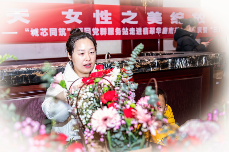 活動現(xiàn)場氣氛熱烈而融洽,居民們邊向老師學(xué)習(xí)邊交流,互相分享自己的插花心得。一朵朵美麗的花朵在大家的手中綻放,仿佛也在訴說著女性的堅(jiān)韌與美麗。